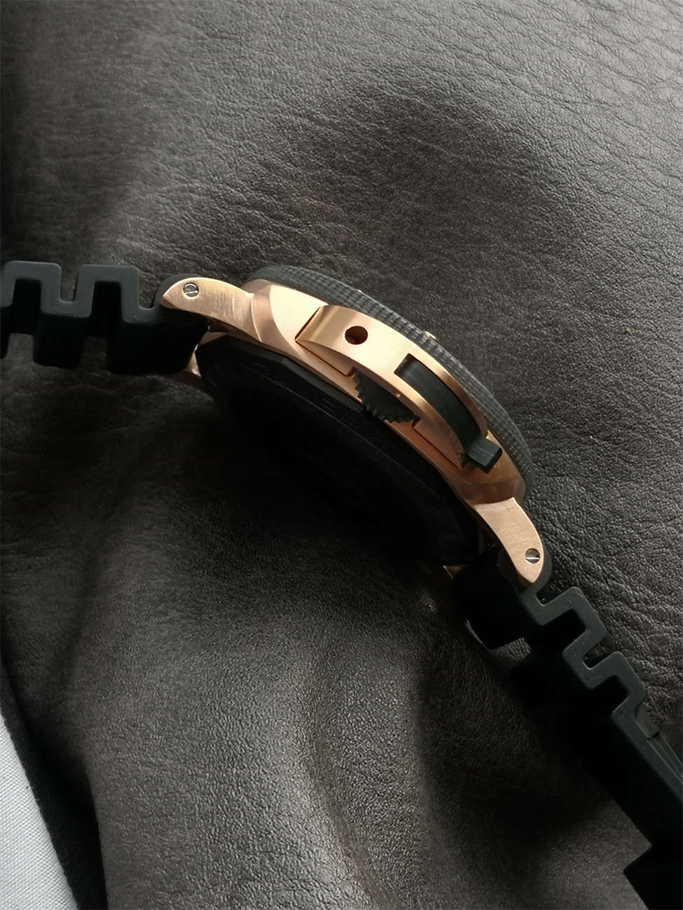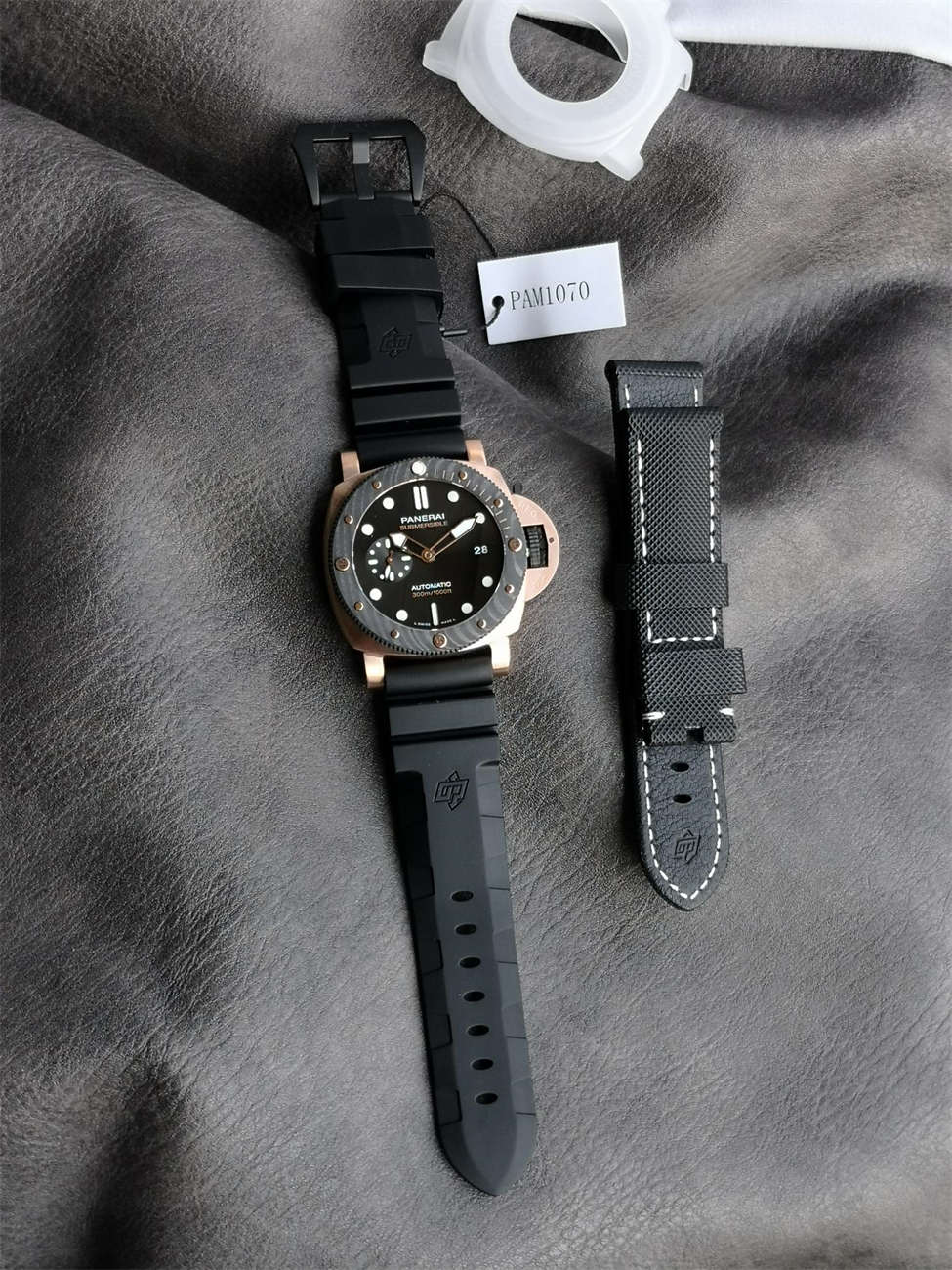 At 44mm, it commands attention. The black rubber strap is soft and comfortable, balancing the visual weight of the gold case. Whether you are diving or at a dinner party, the PAM1070 bridges the gap between a tool watch and a piece of jewelry.