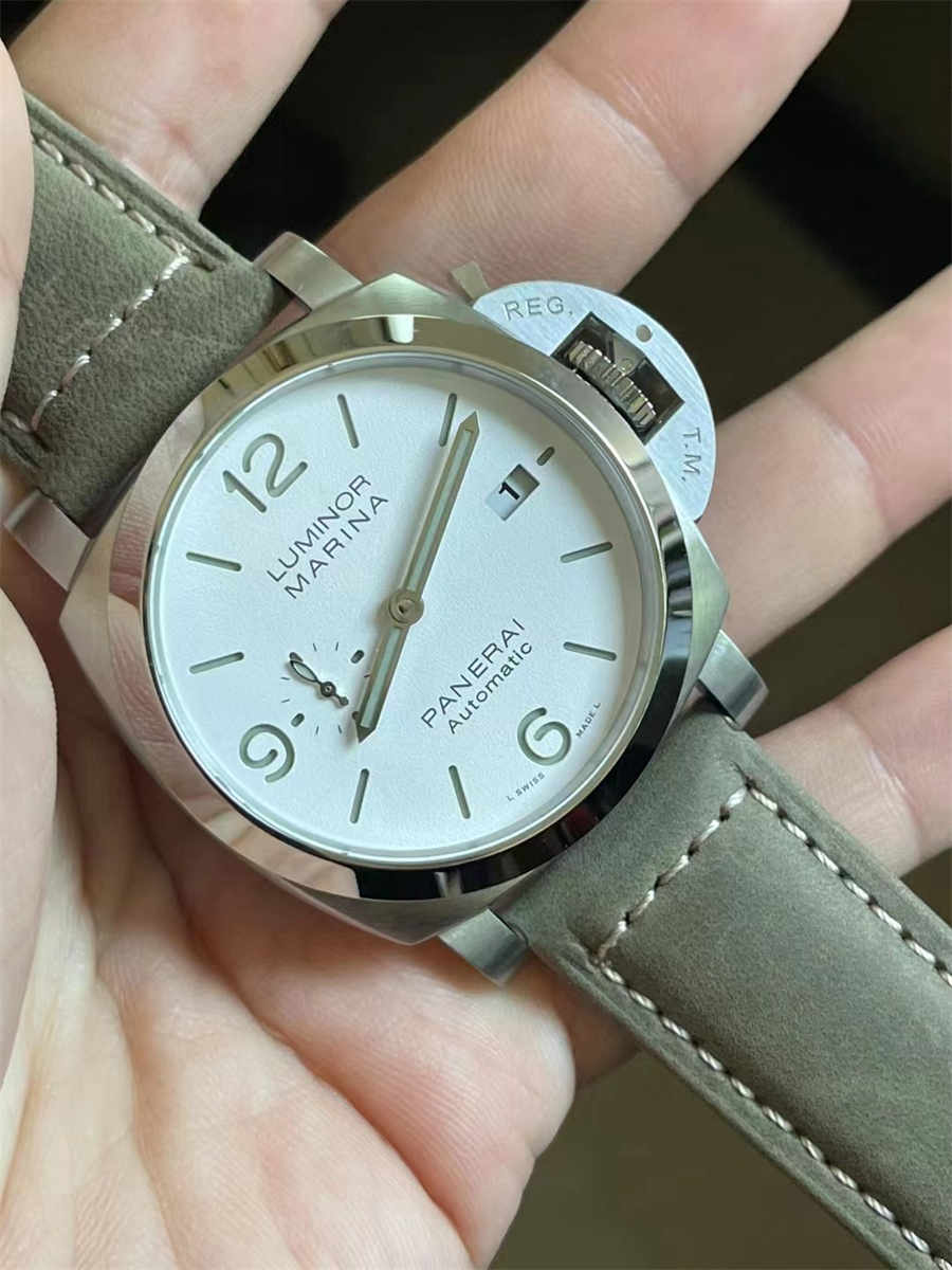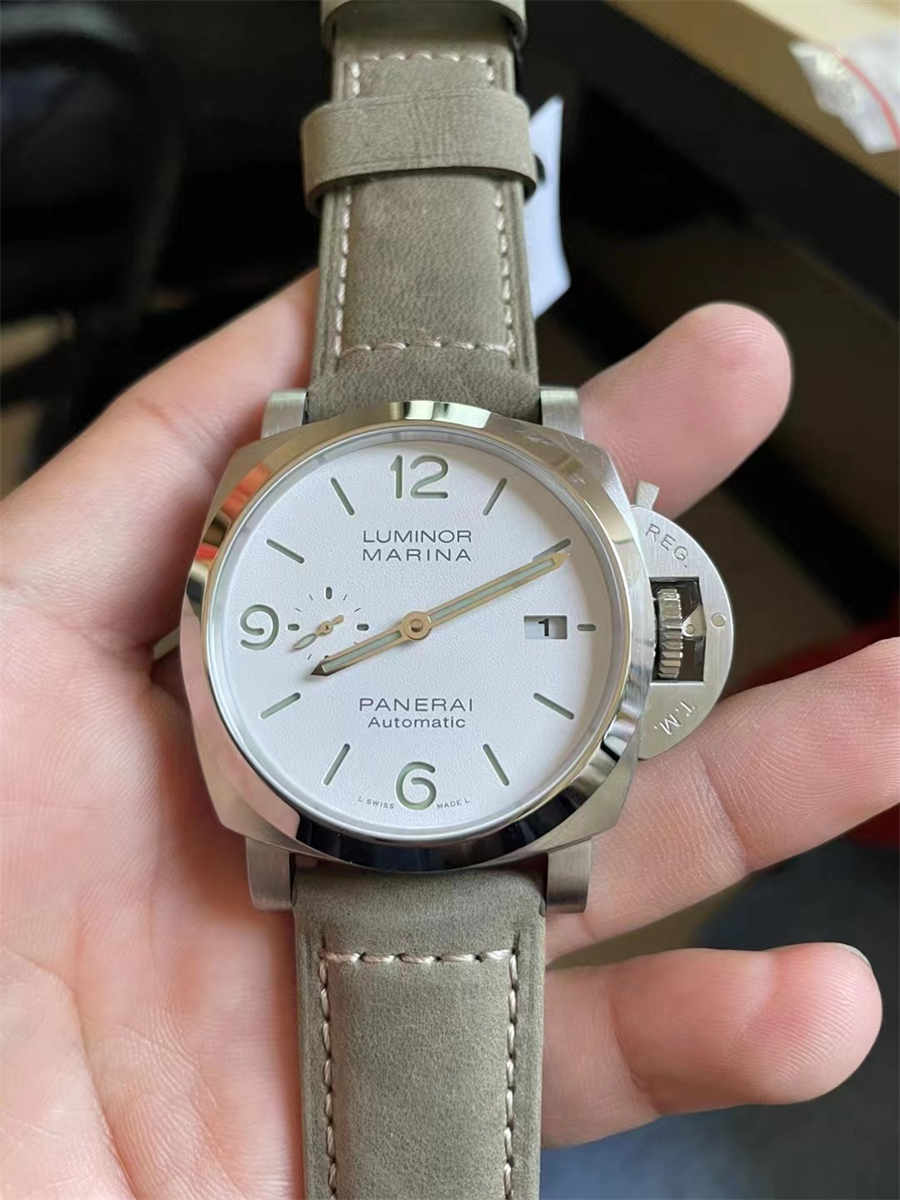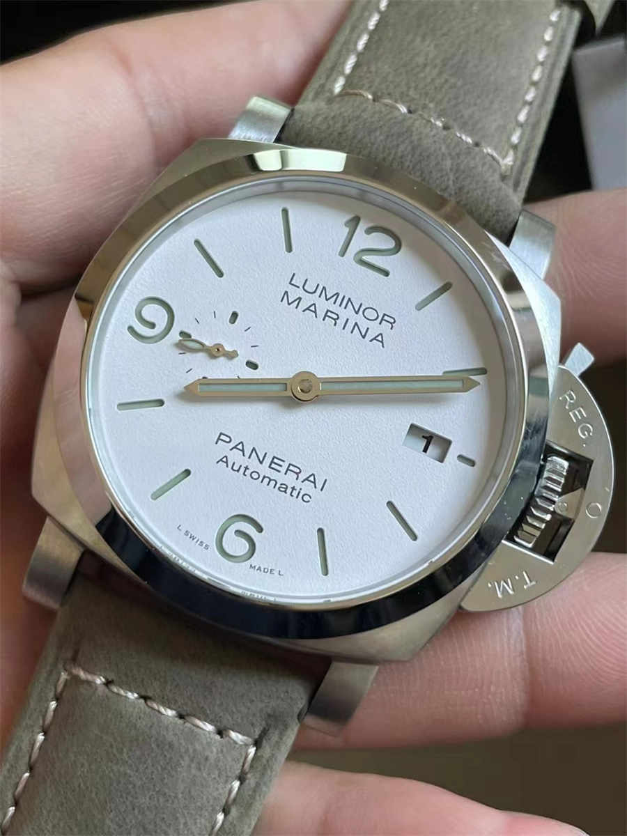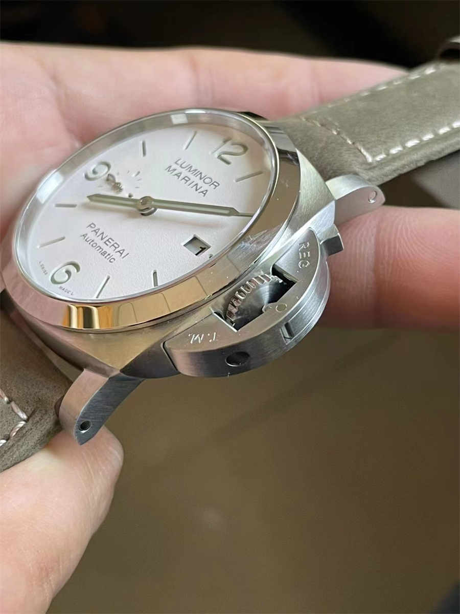 The defining feature of this model is its white dial—a rare color choice within the Luminor series. The surface has a soft matte texture, allowing the black numerals and markers to stand out clearly. A small-seconds display at 9 o’clock adds balance, while the blue-accented hand introduces a subtle touch of color. The lume is evenly applied, delivering excellent visibility in low-light environments without overpowering the dial aesthetics.