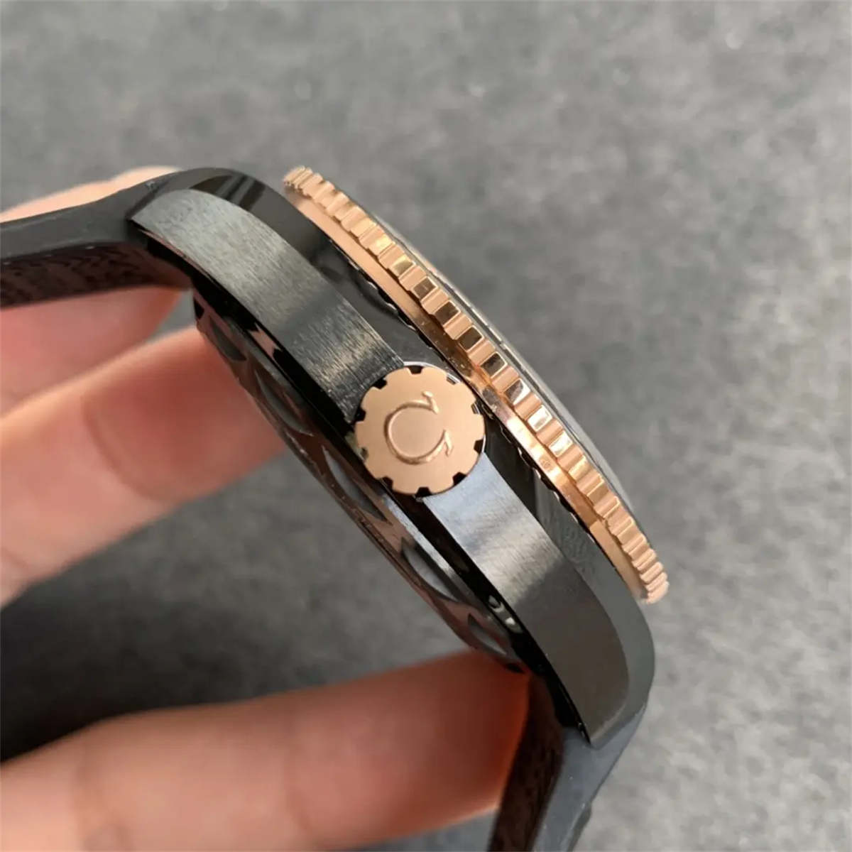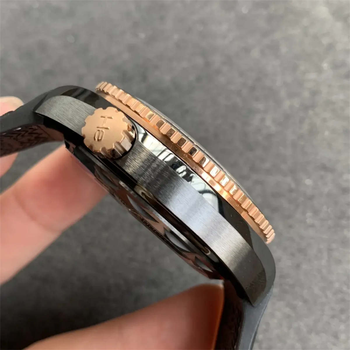 The ceramic rotating bezel uses rose-gold filled minute markers, matching the authentic design.The luminous pearl is slightly brighter and larger than the original—a subtle but non-critical difference.